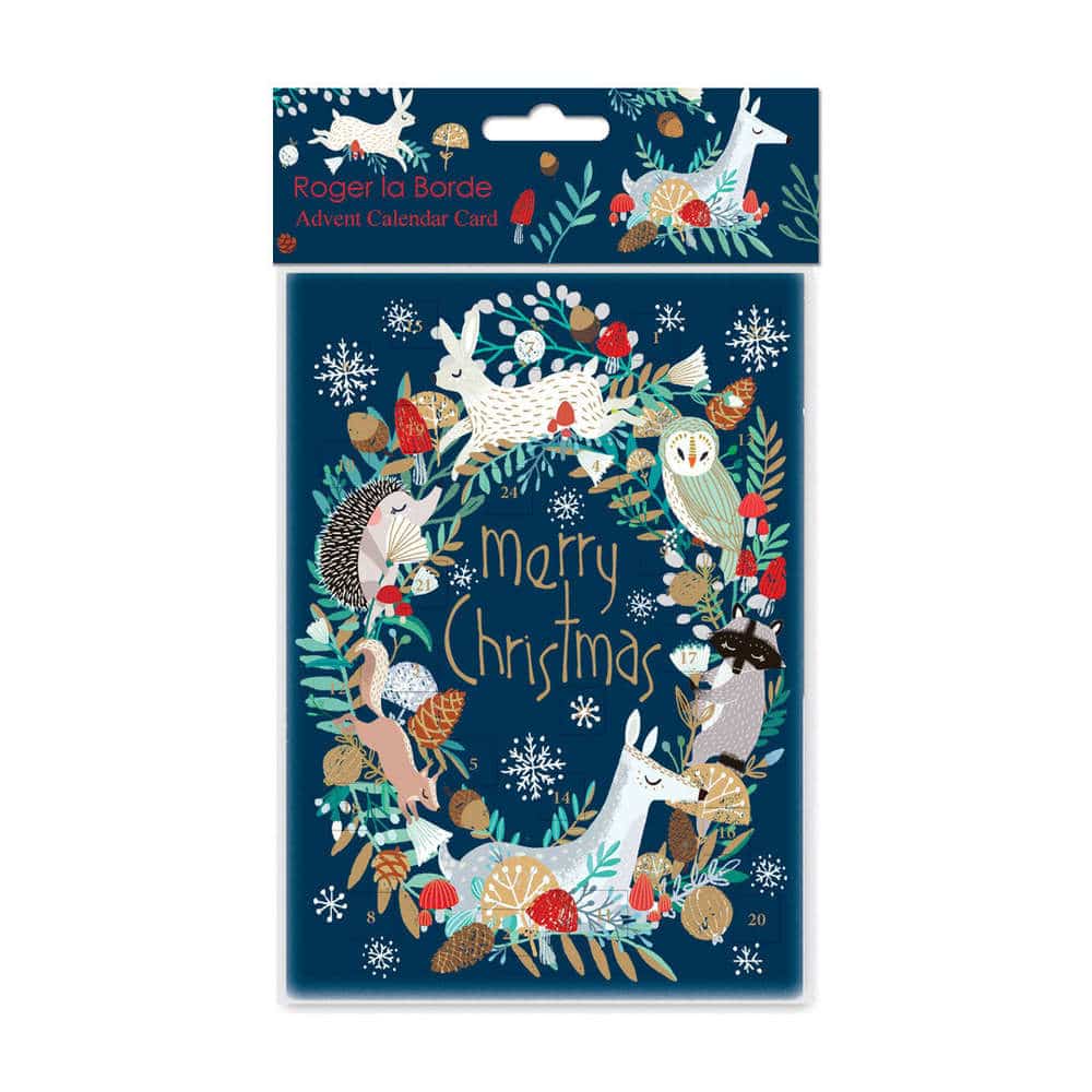 Weihnachts-Grußkarte und zugleich Adventskalender „Animal Wreath“ mit Waldtieren, die zusammen einen Adventskranz bilden.