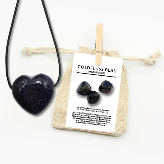 Zur optimalen Aufbewahrung wird der gebohrte blaue Goldfluss Herz-Anhänger in einem Natur-Jutebeutel geschützt. Eine ausführliche Beschreibungskarte wird mitgeliefert. Auf dieser sind allgemeine Informationen sowie die Heilwirkungen auf Körper, Geist und Seele gut zum Immer-wieder-Nachlesen zusammengefasst.