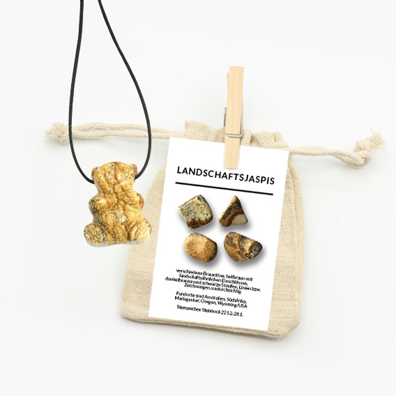 Zur optimalen Aufbewahrung wird der wunderschöne Bär Anhänger Landschaftsjaspis in einem Natur-Jutebeutel geschützt. Eine ausführliche Beschreibungskarte wird mitgeliefert. Auf dieser sind allgemeine Informationen sowie die Heilwirkungen auf Körper, Geist und Seele gut zum Immer-wieder-Nachlesen zusammengefasst.