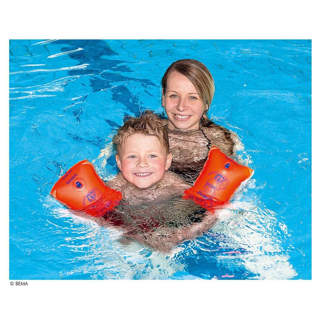 Die BEMA Schwimmhilfe hat pro Schwimmflügel zwei Luftkammern, die dem Kind Auftrieb geben. So kann man mit dem Kind gemeinsam schwimmen oder sich treiben lassen. So gewinnt das Kind Vertrauen und bekommt ein Gefühl für die sichere Bewegung im Wasser.