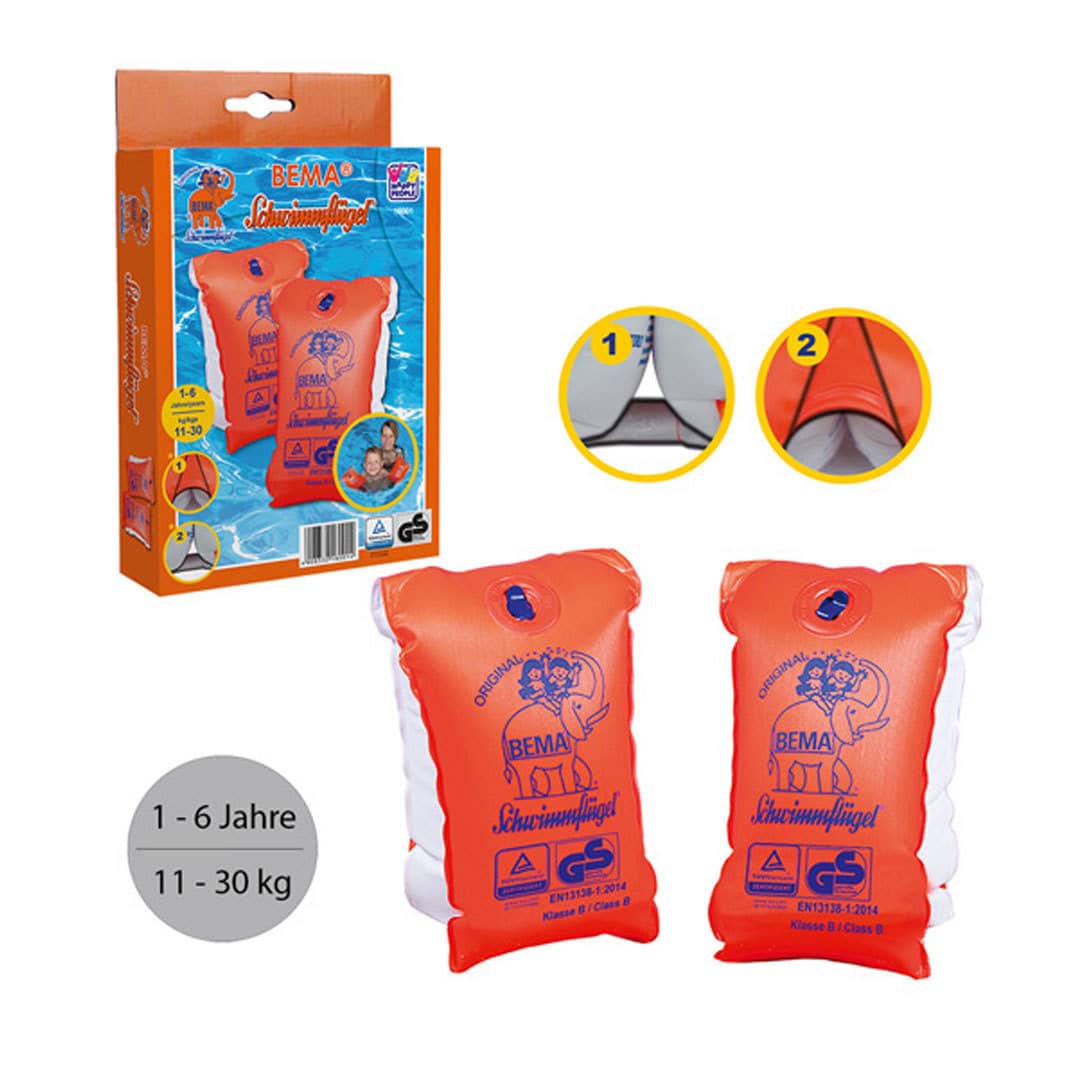 Die Schwimmflügel eignen sich für Kinder mit einem Gewicht von 11 bis 30 kg. Die abgerundeten Ecken der Flügel sorgen für einen hohen Tragekomfort und die flache BEMA-Leiste verhindert das Abgleiten der Schwimmflügel.