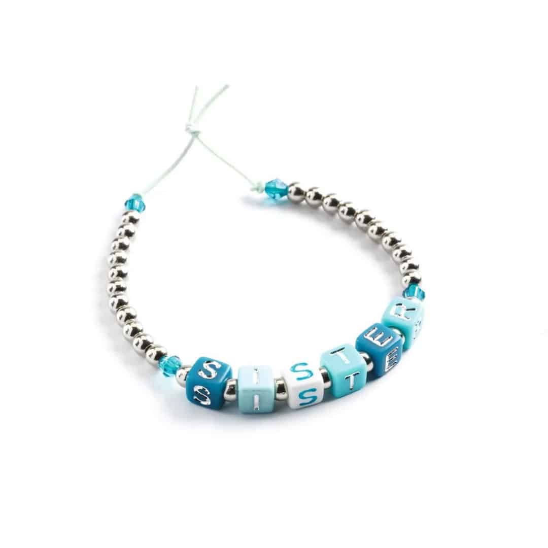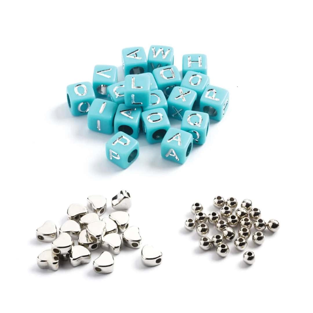 Kreatives Schmuck Bastel-Set „Buchstaben Silber“ zum Selbstgestalten von Ketten und Armbändern, mit Namen oder Botschaften sowie mit farblich aufeinander abgestimmten Schmuckperlen für schönen Schmuck in pastell-blau-silbernen Farben.