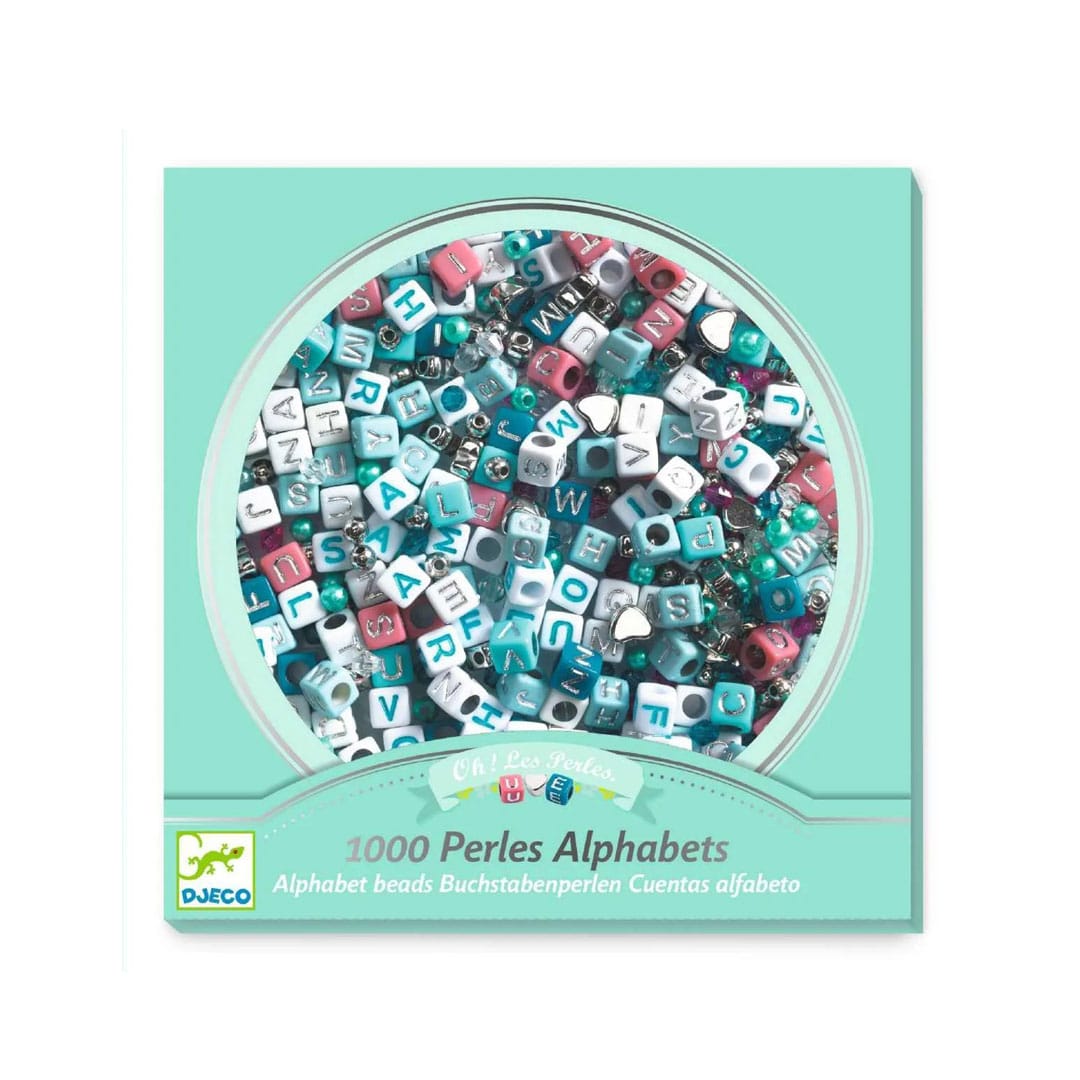 Schmuck-Bastelset mit insgesamt 1000 Bastelperlen aus Acryl, mit Buchstaben und farbig darauf abgestimmte silberne und blaue Glitzerperlen,