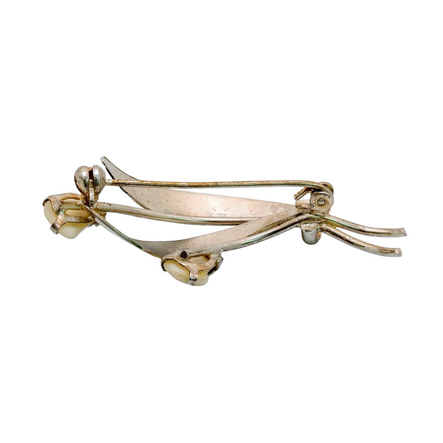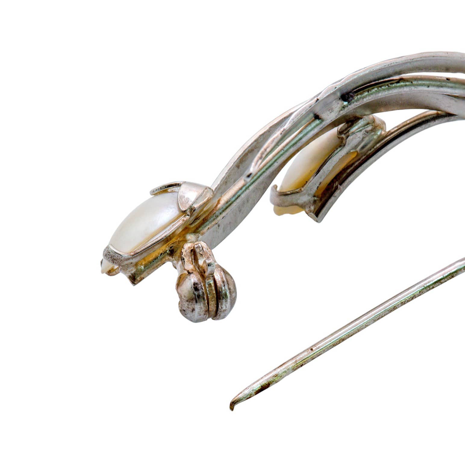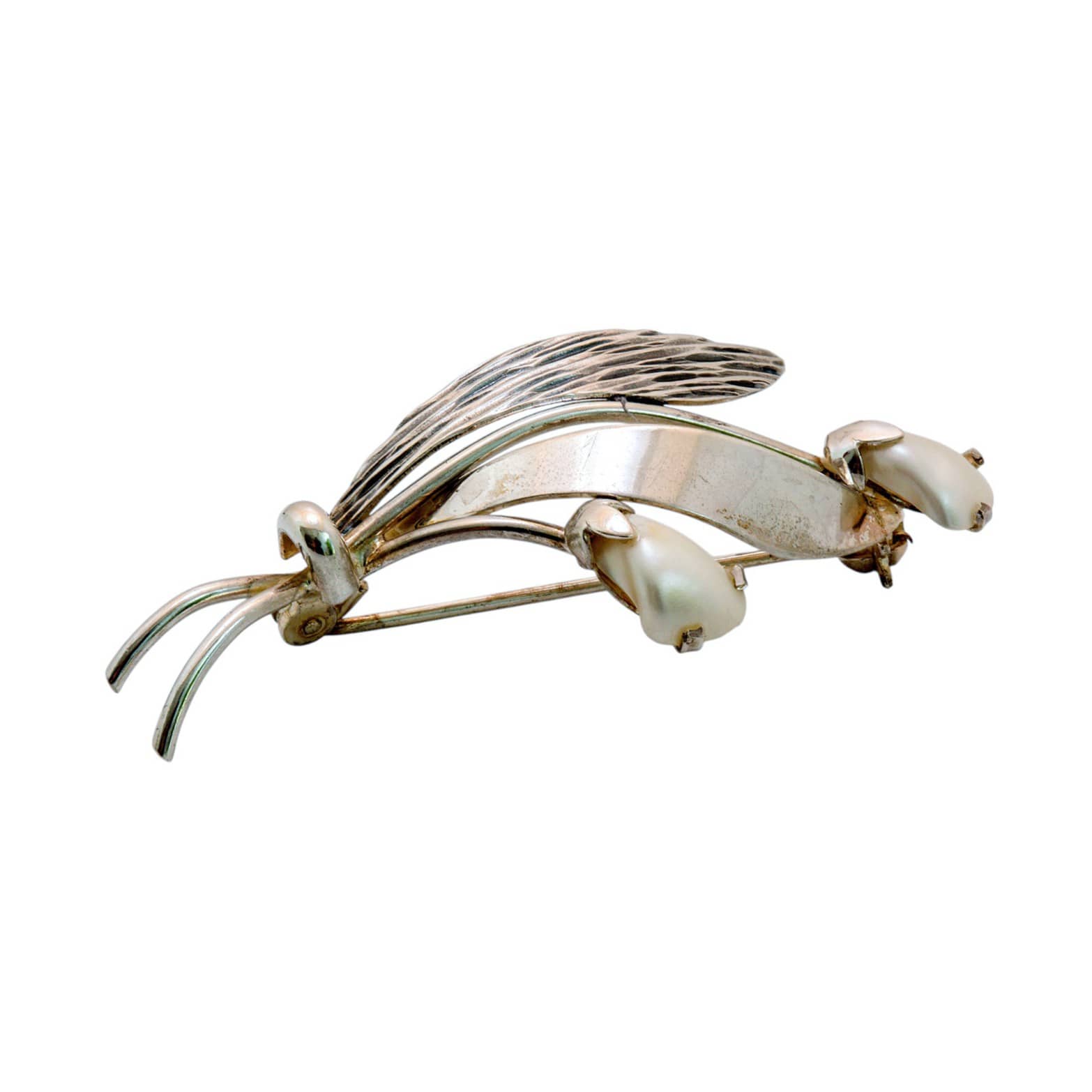 Diese edle Brosche aus 835er Silber stammt von der bekannten deutschen Silberschmiede Teka und verkörpert feine Handwerkskunst der 1950er- bis 1970er-Jahre. Ihr elegantes, florales Design erinnert an stilisierte Maiglöckchen – drei zart geschwungene Blütenstiele, die in echte, halbhohe Perlen gefasst sind.