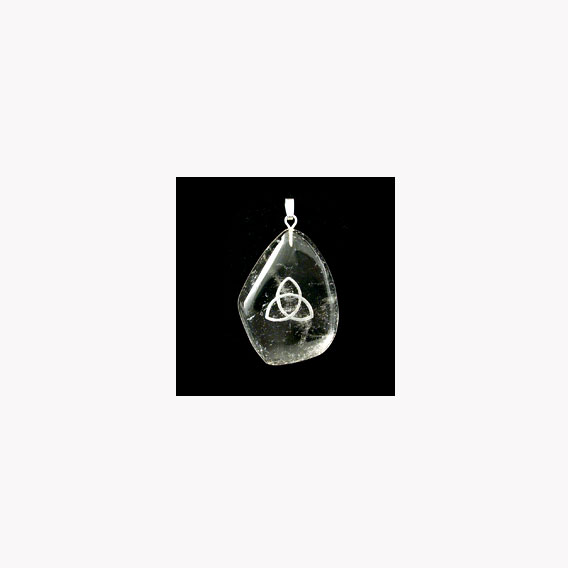 Die Energie Amulette bestehen aus reinem Bergkristall und haben eingravierte Symbole. Die Bergkristallanhänger mit Öse sind auf Band attraktiv auf einer detaillierten Beschreibungskarte in einer Zellophanverpackung drapiert.