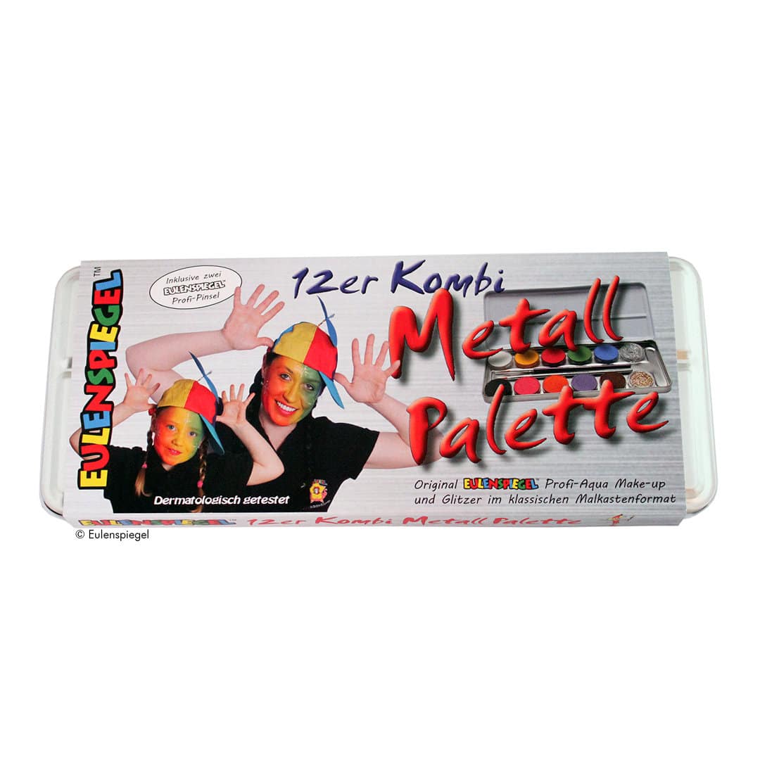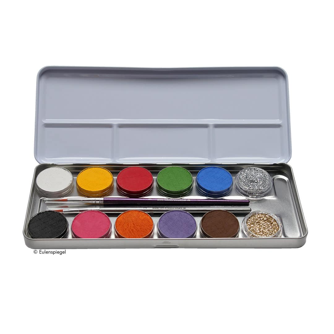 Mit seinen Metall-Paletten im klassischen Malkasten-Format bietet Eulenspiegel die wichtigsten Farben im Set an, zusammen mit einem Profi-Pinsel zum Auftragen der Schminkfarbe. Die Metallkästen können auch nachgefüllt werden!