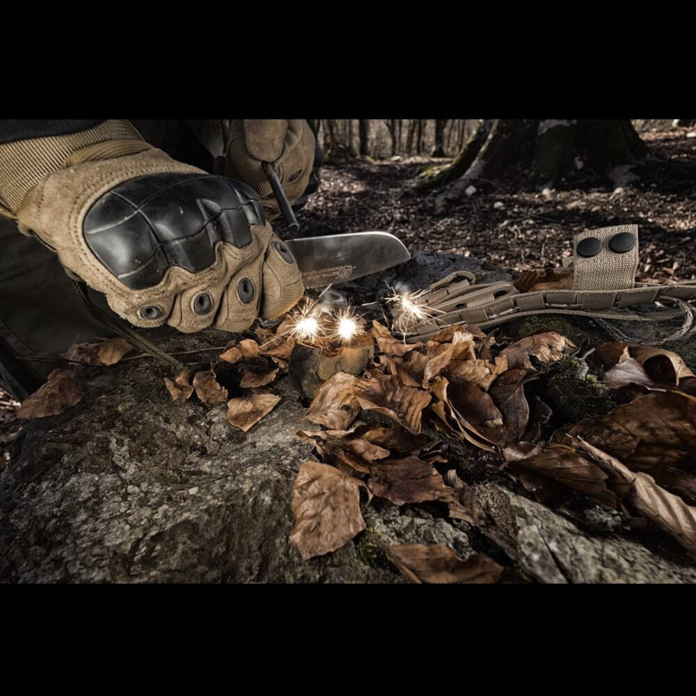 Die Schei­de besteht aus einem Teil aus sehr leich­tem und mini­ma­lis­ti­schem Kydex. Sie kann zer­legt und sowohl für Links- als auch für Rechts­hän­der ange­passt wer­den. Mit einem optio­na­len Gür­tel­clip kann das Mes­ser sowohl ver­ti­kal als auch hori­zon­tal posi­tio­niert wer­den, was die Schei­de viel­sei­ti­ger macht als die Tex­til­ver­si­on. Es ist außer­dem mit einer Mini­ta­sche mit M.O.L.L.E.-System aus­ge­stat­tet, die ein Para­cord mit brenn­ba­rem Faden ent­hält, das im Not­fall und/oder bei schwie­ri­gen kli­ma­ti­schen Bedin­gun­gen ver­wen­det wer­den kann, sowie einen Fires­teel zum Anzün­den von Feuer.