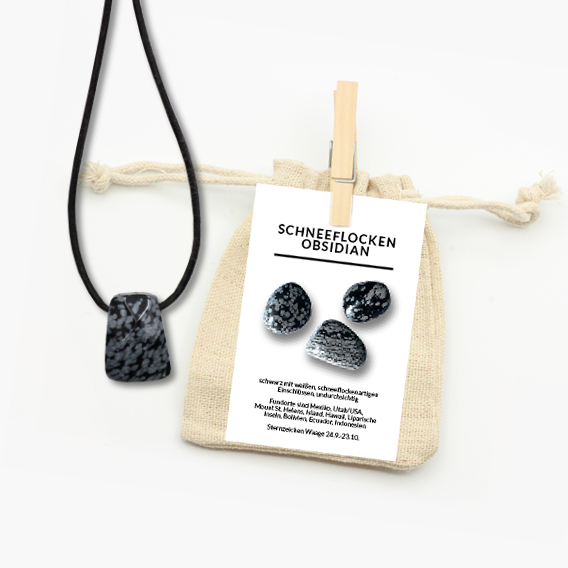Zur optimalen Aufbewahrung wird der Facetten-Anhänger aus Schneeflockenobsidian in einem Natur-Jutebeutel geschützt. Eine ausführliche Beschreibungskarte wird mitgeliefert. Auf dieser sind allgemeine Informationen sowie die Heilwirkungen auf Körper, Geist und Seele gut zum Immer-wieder-Nachlesen zusammengefasst.