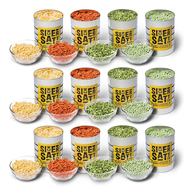 Zwölf 2-Liter-Dosen mit verschiedenen Gemüsesorten zum Vorteilspreis.