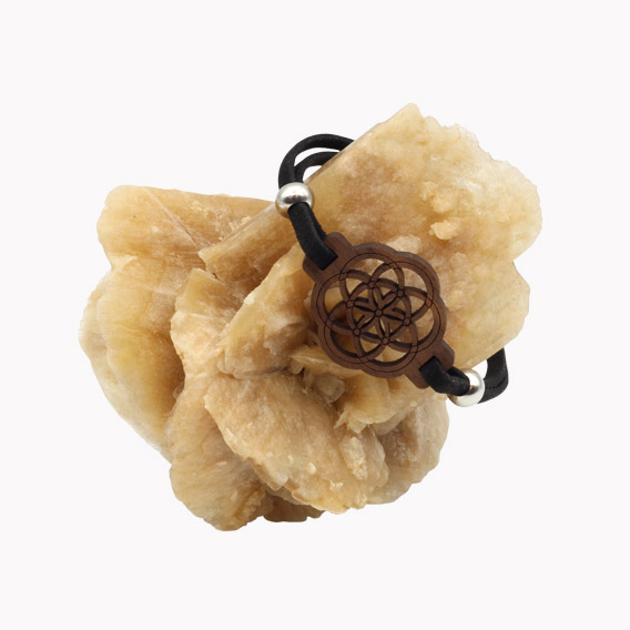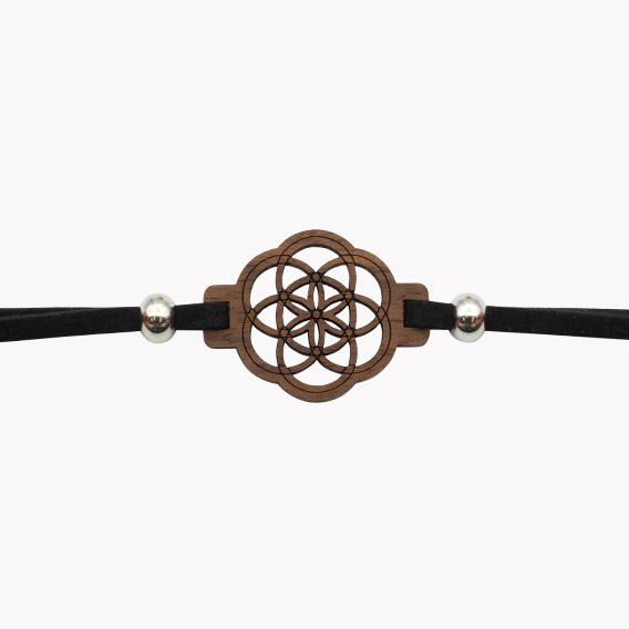 Das Armband besteht aus einem Textilband und dem Schmucksymbol Same des Lebens aus Nuss-Holz.