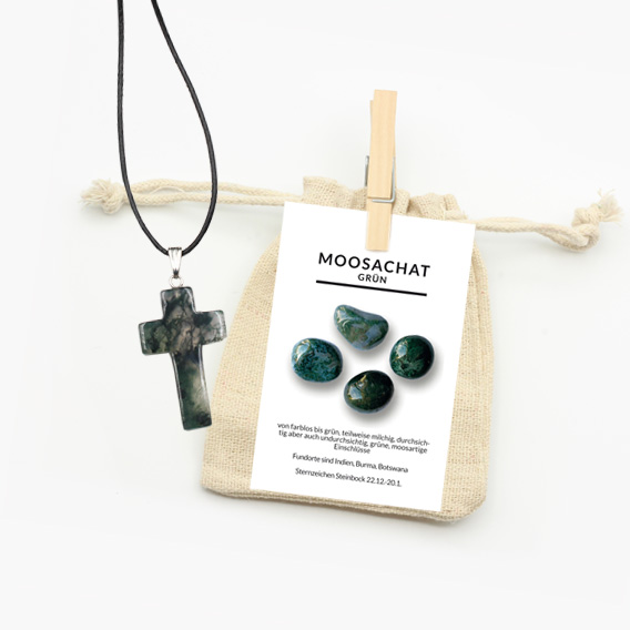 Zur optimalen Aufbewahrung wird der wunderschöne Kreuz Anhänger aus Moosachat in einem Natur-Jutebeutel geschützt. Eine ausführliche Beschreibungskarte wird mitgeliefert. Auf dieser sind allgemeine Informationen sowie die Heilwirkungen auf Körper, Geist und Seele gut zum Immer-wieder-Nachlesen zusammengefasst.