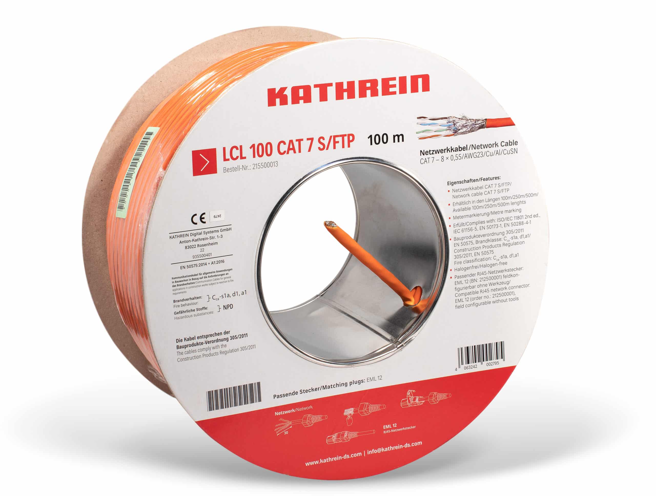 Netzwerkkabel Cat.7, S FTP, Kupfer AWG23, BauPVO 305 2011, EN50575, Cca s1ad1a1, LSZH LS0H, RAL 2003, Aussendurchmesser 7,2 mm, Kupferanteil typ. 20 kg je km.