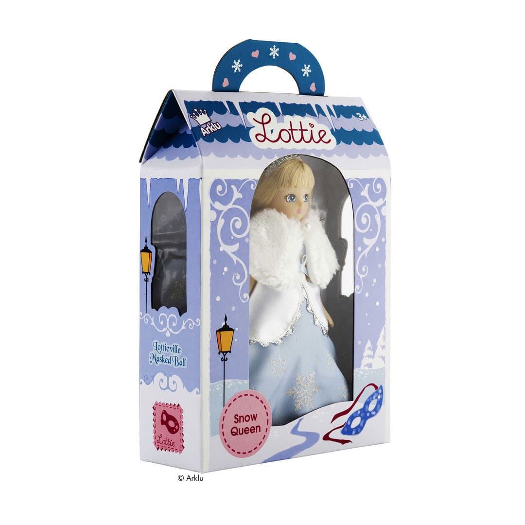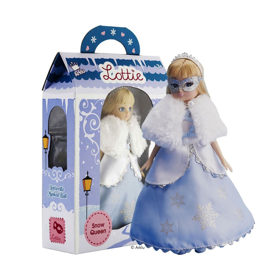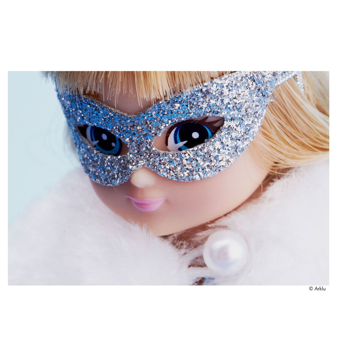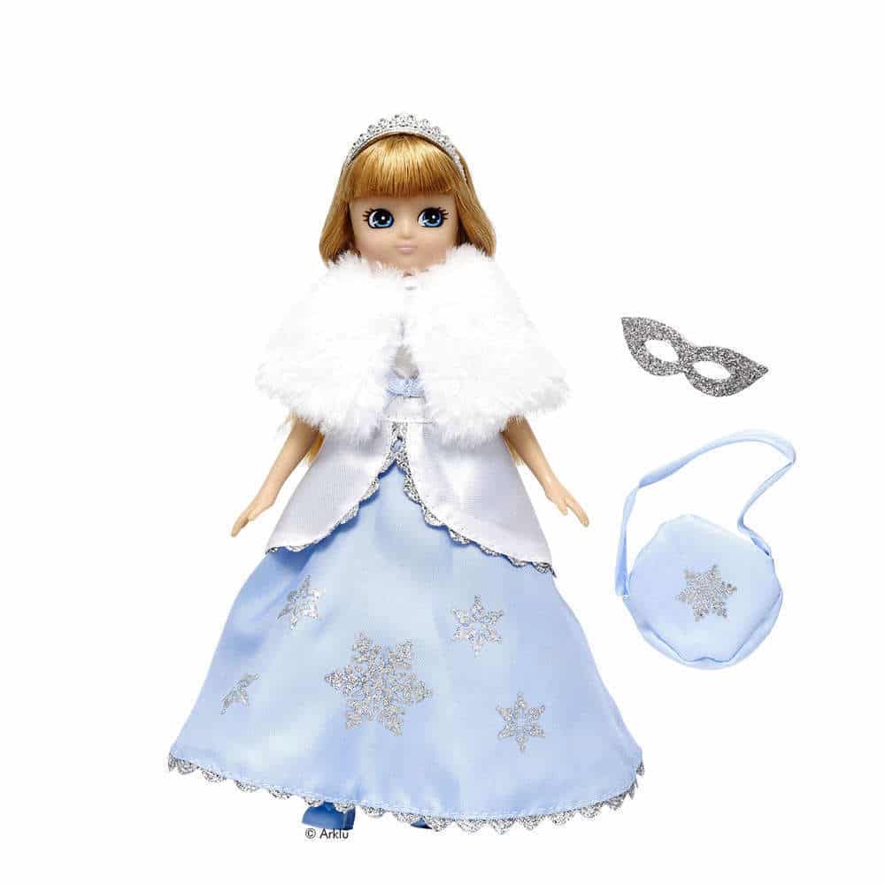 Dunkelblonde Spielpuppe Lottie Puppe Schneekönigin mit blauen Augen. Mit eiskristallfarbenem Kleid und flauschigem Umhang, einer silber-glitzernden Maske, Diadem und weiteren Accessoires.