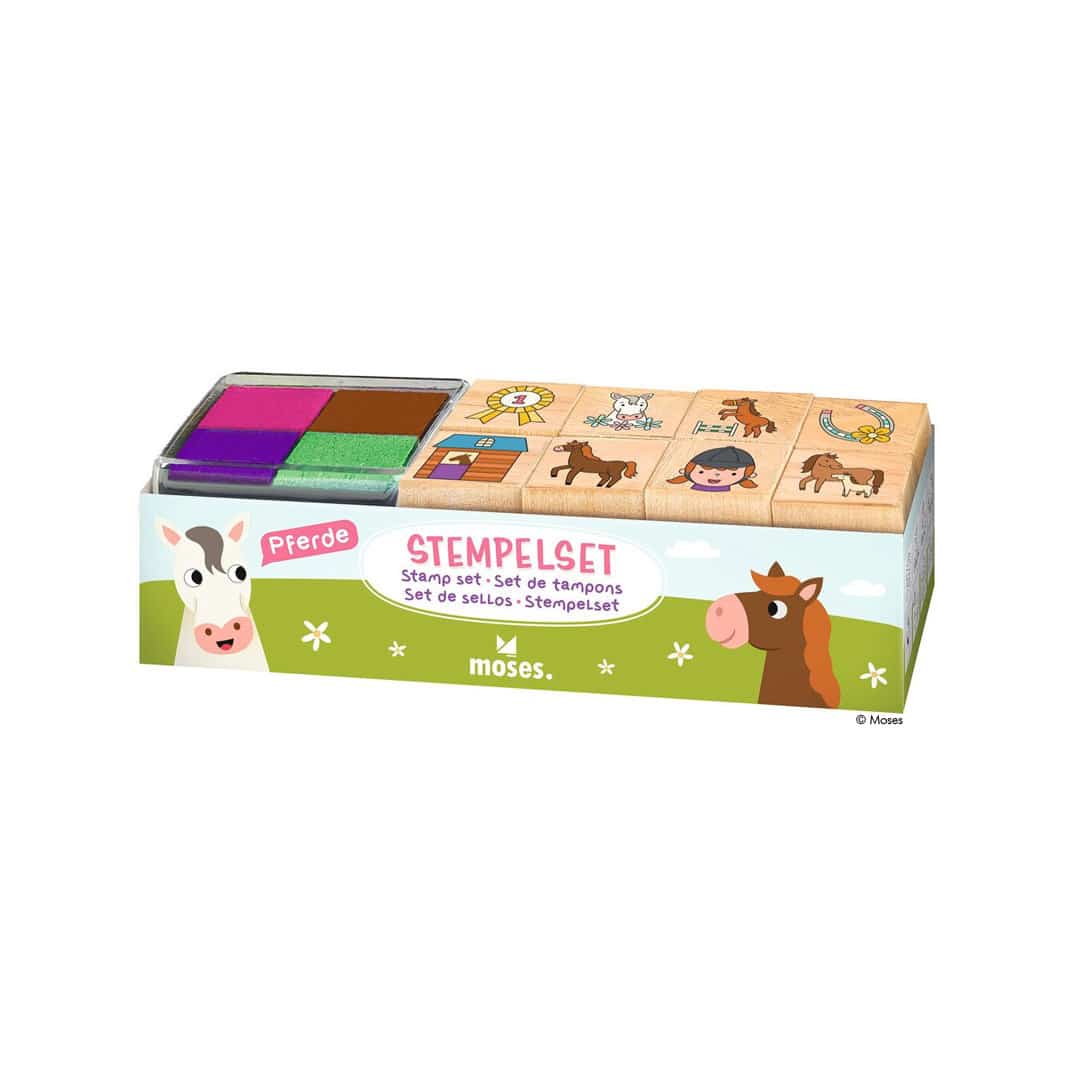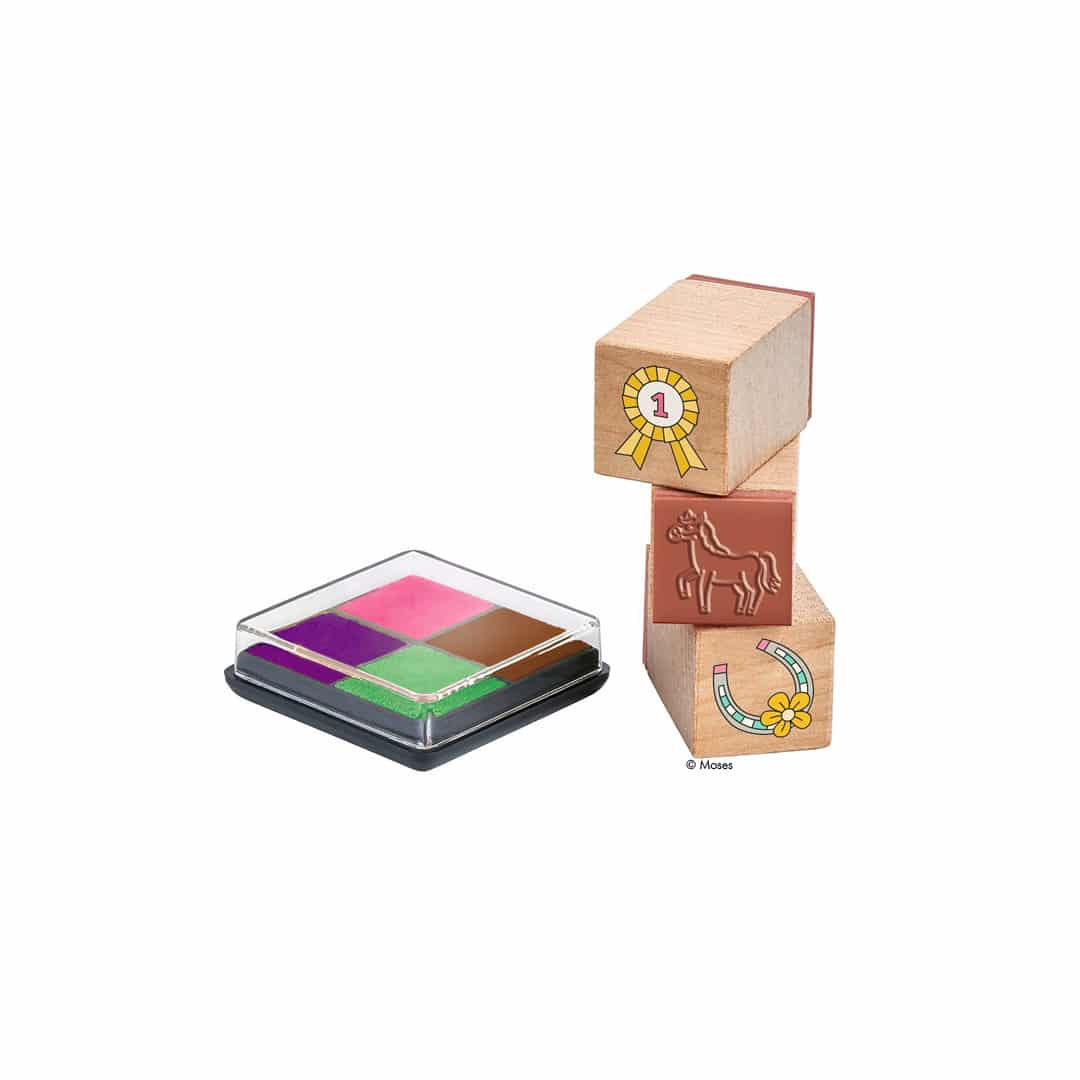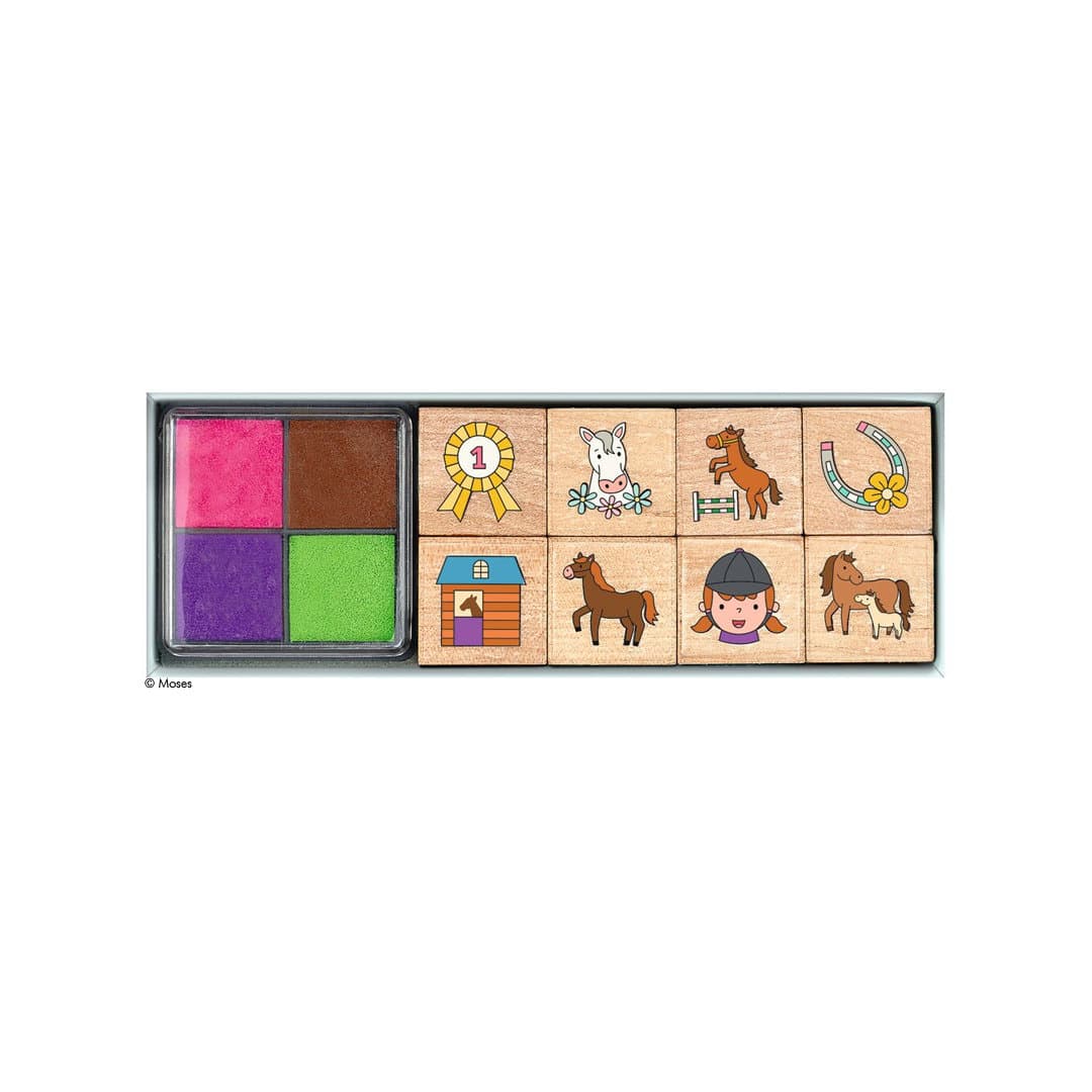 Stempel-Set: 8 Stempel aus Holz und Gummi mit verschiedenen Pferde-Motiven, inkl. Stempelkissen mit vier Farben,