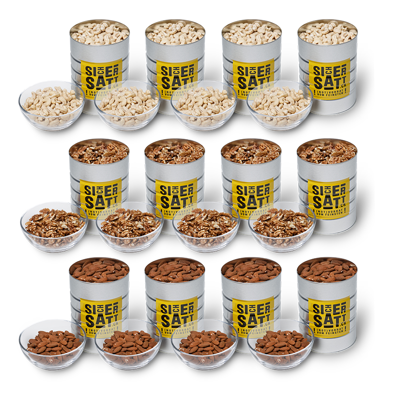 Twelve 2-liter cans with various nuts and almonds, at a special price.