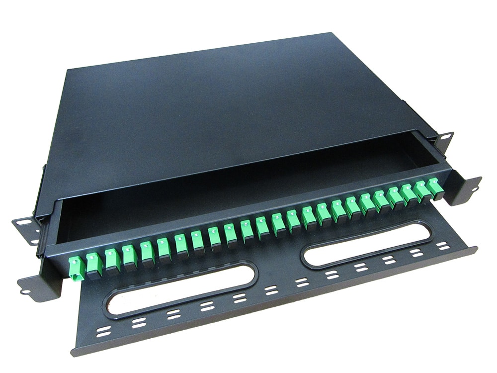 OPP 24 ist ein 19“-Einschub mit ausziehbarem Fach und 24 auf der Frontseite vormontierten Simplex-Adaptern SC/APC-SC/APC. An diese Adapter können die Ein- und Ausgänge folgender optischer Verteiler, Abzweiger und Wellenmultiplexer angeschlossen werden: