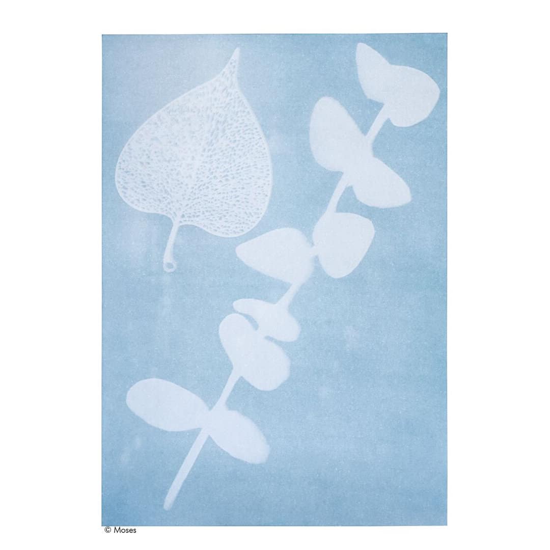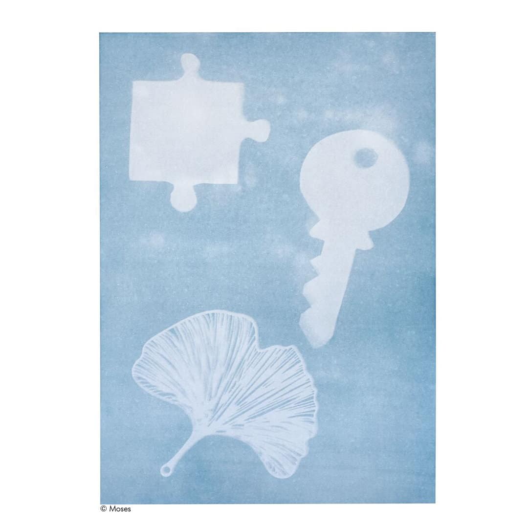 Wie das sein kann? – Das Papier ist auf der einen, dunkleren Seite mit eisenhaltigem Pulver beschichtet. Daraus bildet sich durch Einwirkung des Sonnenlichts ein blauer Farbstoff, der nicht dorthin gelangt, wo der Gegenstand draufgelegen hat.