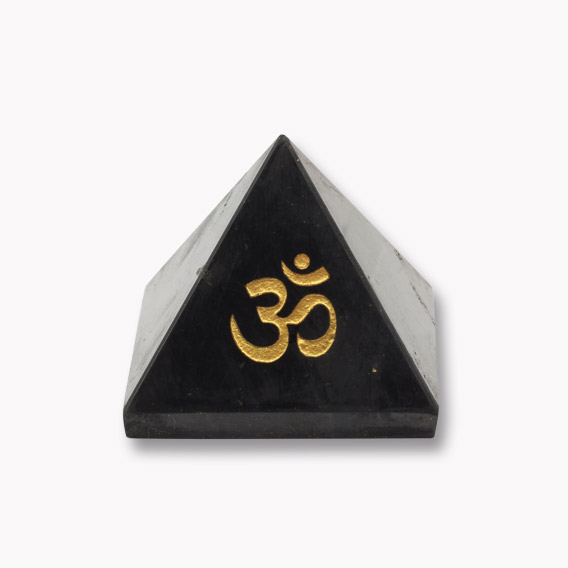 Die wunderschöne Pyramide aus dem Edelstein Shungit hat eine hochwertige vergoldete Gravur.