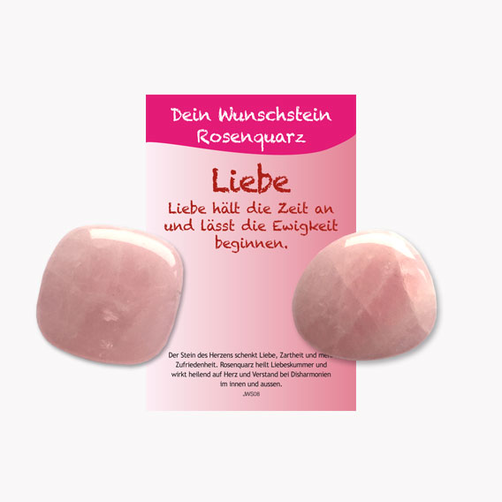 Der Rosenquarz steht für Liebe und Partnerschaft. Rosenquarz ist der Stein des Herzens und eignet sich mit seinen zarten Schwingungen besonders für junge Menschen. Er schenkt uns Liebe, Zärtlichkeit und mehr Zufriedenheit mit uns selbst und mit unseren Mitmenschen. Rosenquarz heilt Herzschmerzen und Liebeskummer.