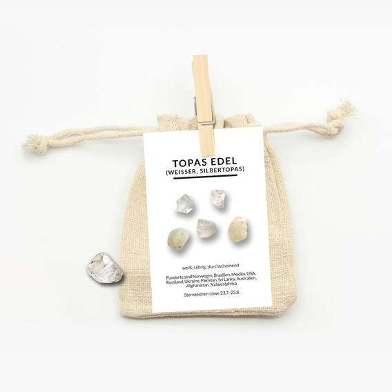 Zur optimalen Aufbewahrung wird der Topas edel-Trommelstein in einem Natur-Jutebeutel geschützt. Eine ausführliche Beschreibungskarte wird mitgeliefert. Auf dieser sind allgemeine Informationen sowie die Heilwirkungen auf Körper, Geist und Seele gut zum Immer-wieder-Nachlesen zusammengefasst.